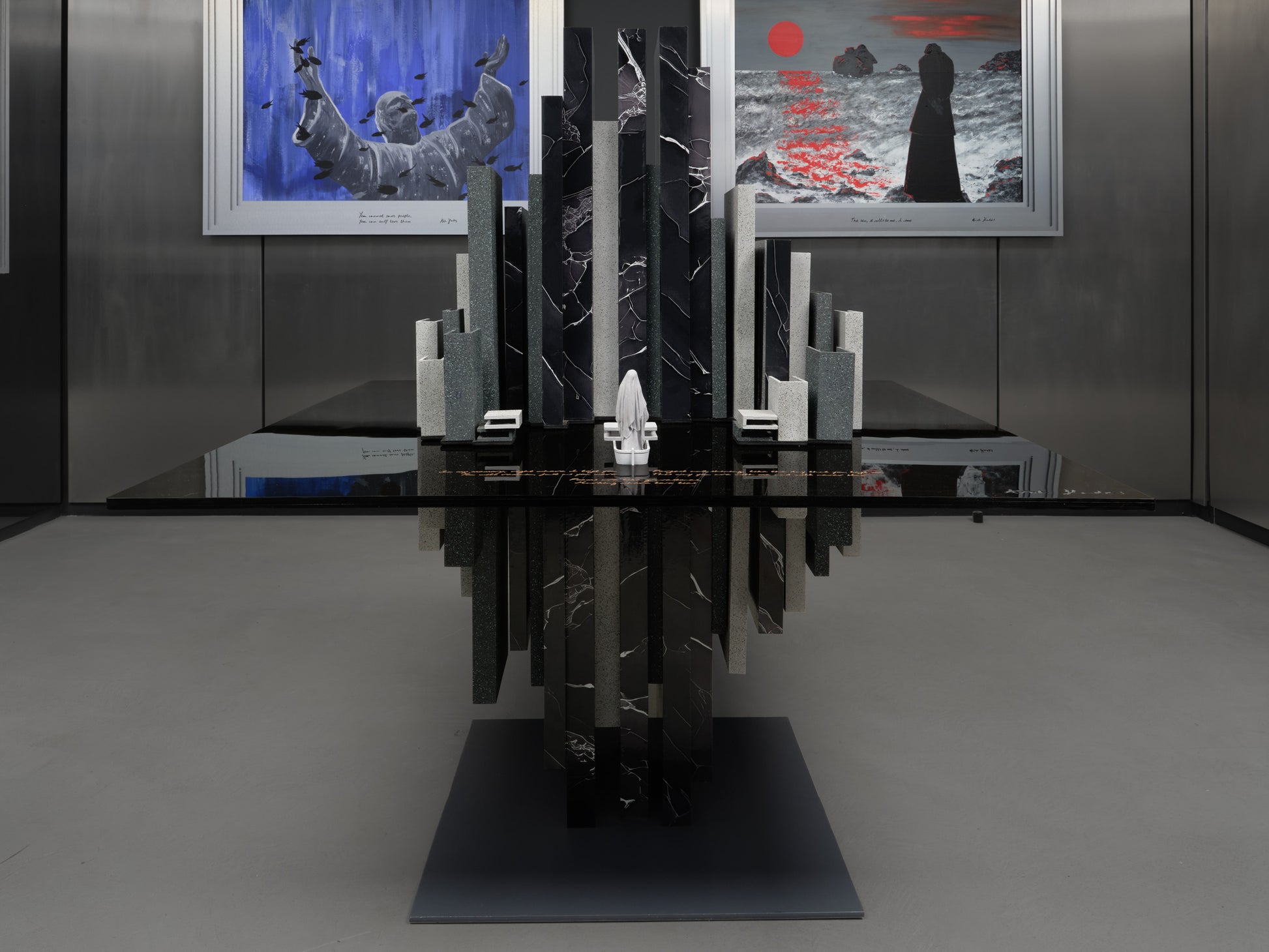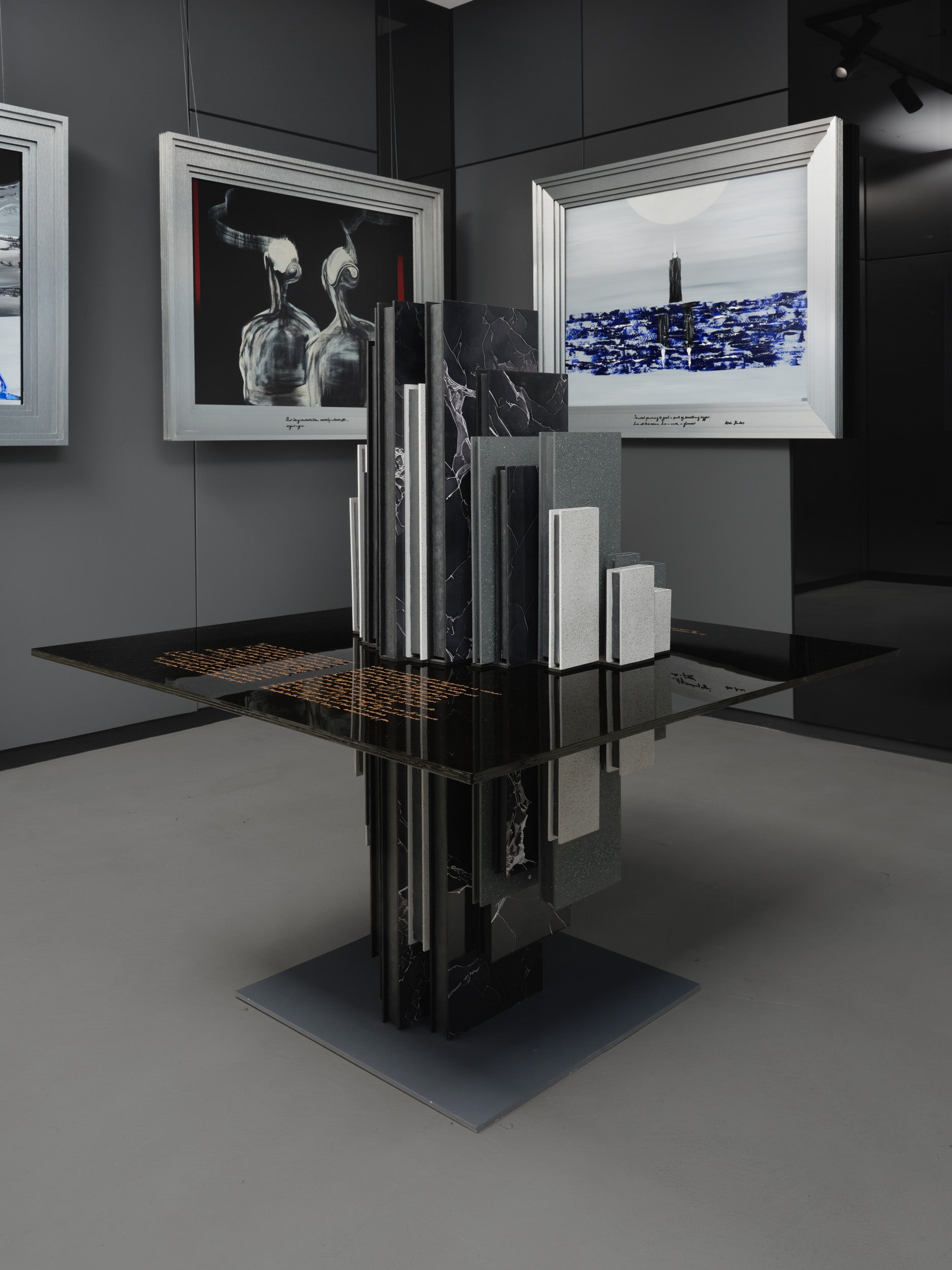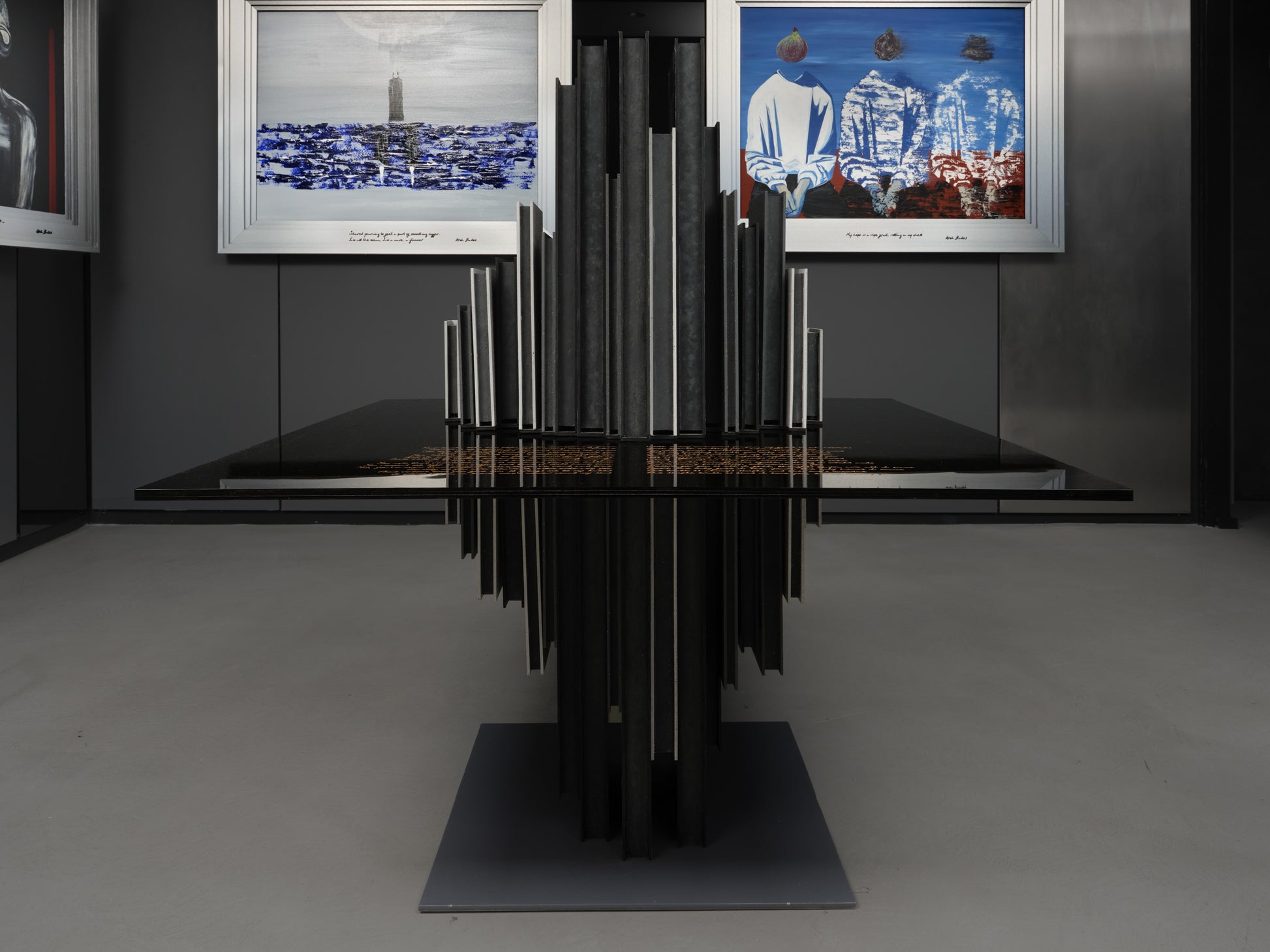 The idea for this sculpture began from Arch Hades’ line of poetry ‘poems are like gravestones, marking where love lies’ (etched in Hades’ handwriting on the black, polished ‘lagoon’ plane) to indicate the artists’ intention of burying loved ones in poetry and books, this way also making visitations easier with the simple re-reading or recitation of a poem.