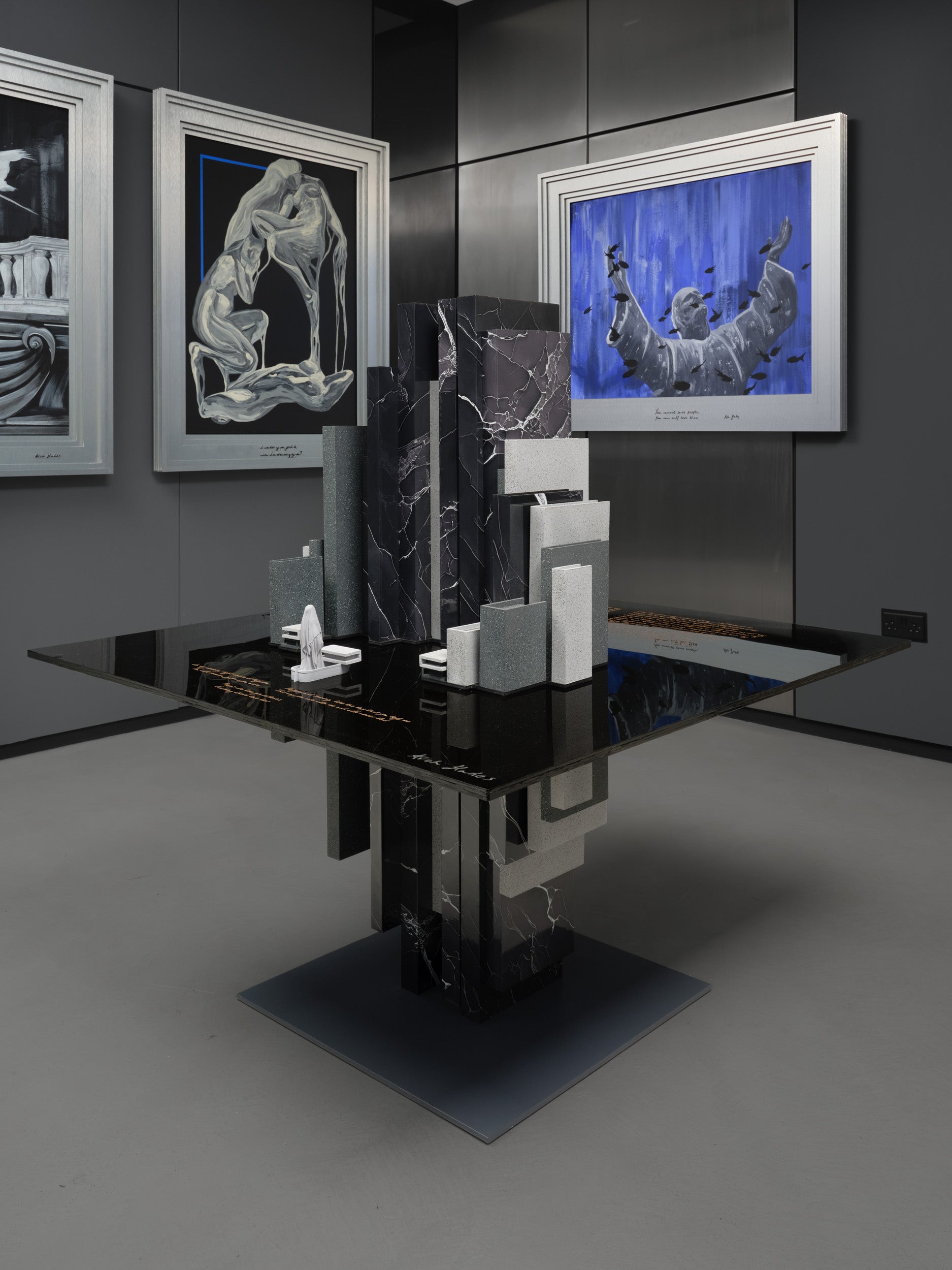 The ferryman, clocked in white, is seen to be delivering a new book to the Isle, to put with the rest of the artists’ treasures moments. Around the isle, lines of gold poetry float, engraved in the artist’s handwriting, immortalising the memory of loved ones.